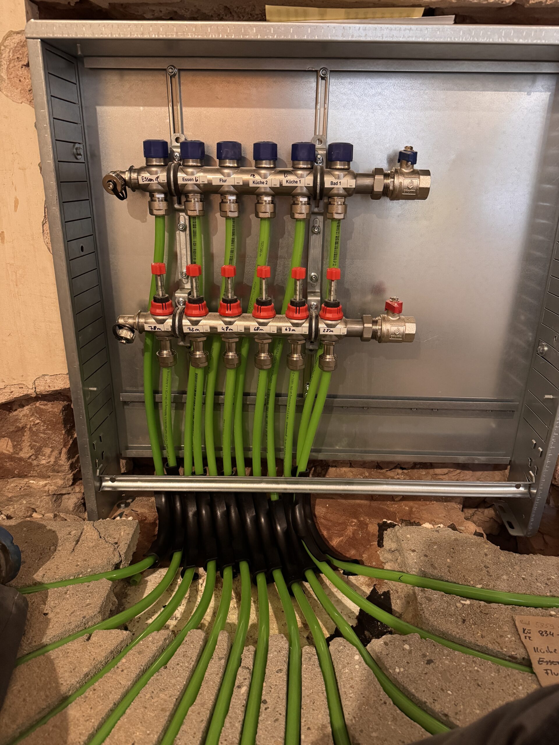 Zu Beginn setzen wir den Verteilerkasten und montieren den Heizkreisverteiler fachgerecht. Dieser bildet das zentrale Element der Anlage und sorgt dafür, dass die Wärme später gleichmäßig auf alle Heizkreise verteilt wird.